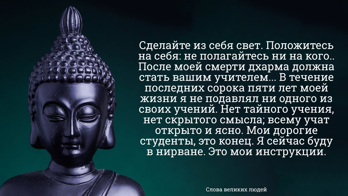 Мастер Готама умер в возрасте восьмидесяти лет от несварения желудка. Такие детали, как настаивают ученые, слишком затруднительны, чтобы их можно было придумывать. Соответственно, они могли быть исторически точными. Когда ему исполнилось восемьдесят, он заболел в Вайшале, по дороге из Раджагрихи в Шравашту. Он продолжал путешествовать, пока не приехал в Паву, где серьезно заболел из-за еды, предложенной ему кузнецом Чунда. В конце концов, несмотря на сильную боль и слабость, он пришел в лес, граничащий с Кусинагаром (в современном индийском штате Уттар-Прадеш ). Лежа в «позе собаки» (на боку) между двумя большими деревьями, обращаясь в последний раз к своим ученикам, Будда сказал: Под руководством Ананды , любимого ученика Будды, его друзья сожгли тело в Кусинагаре. Семь ближайших правителей, а также царь Аджатасатру потребовали, чтобы им был передан прах. Король Кусинагара сначала отказался, и дебаты почти закончились войной; но по совету мудрого человека по имени Дрон кризис утих, и