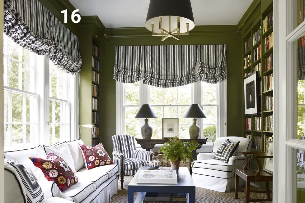 Зеленые акценты оживляют террасу в нэшвиллском доме Jon и Keith Meacham. Диван и кресла обиты холстовой уткой, стул библиотеки Regency покрыт той же хлопковой полосой Quadrille, что и римские шторы; потолочное крепление от Visual Comfort, сизальный ковер от Lenos, а стены окрашены в Palmetto Duron Paints & Wallcoverings.