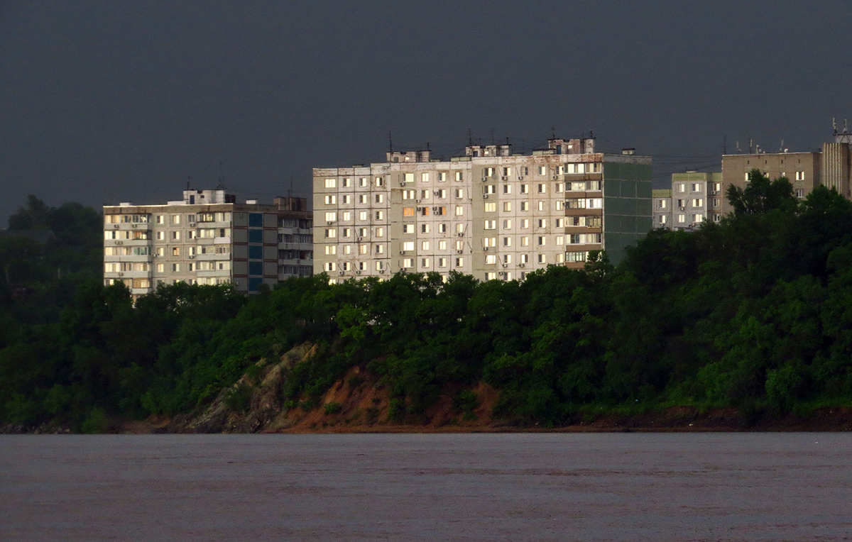 Из глухих сёл вдоль речек Тунгуска и Кур мы возвращались в город. Проснувшись, я увидел, что по левому борту "вдоль Амура белым парусом высятся дома Хабаровска":