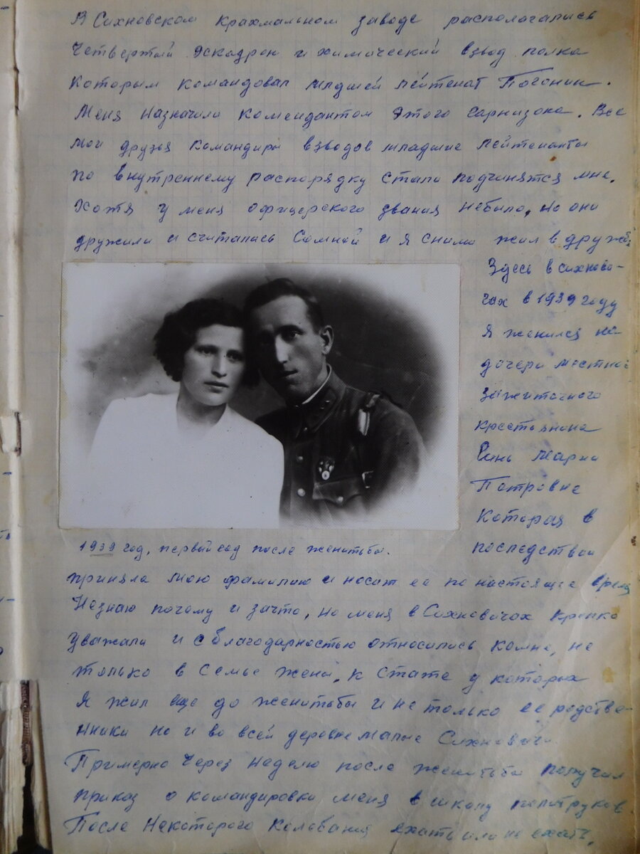В Сихновском крахмальном заводе расположился 4-й эскадрон и химический взвод полка которым командовал младший лейтенант Погонин. Меня назначили комендантом этого гарнизона. …Здесь в Сихновичах в 1939 году я женился на дочери местного зажиточного крестьянина Гинь Марии Петровне которая в последствии приняла мою фамилию и носит ее до сих пор. Не знаю почему и за что, но меня в Сихновичах крепко уважали и с благодарностью относились ко мне не только в семье жены, у которой я кстати жил еще до женитьбы, и не только ее родственники, но и во всей деревни Малые Сихновичи…