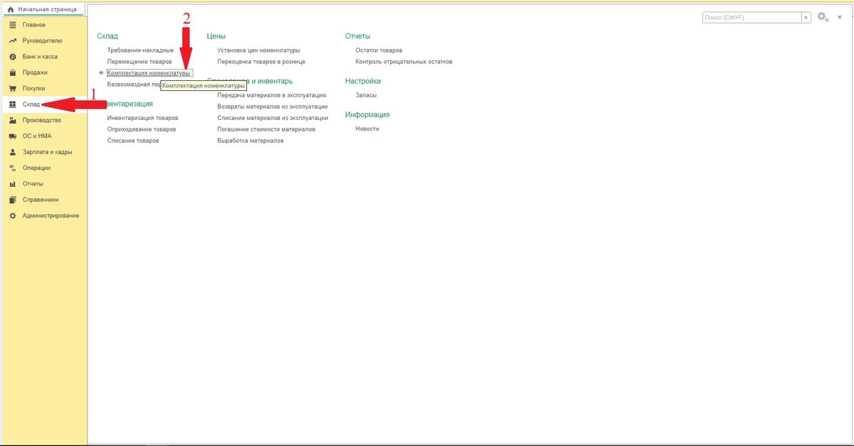 Для проводки пересортицы, о которой говорилось в примере, необходимо использовать комплектацию номенклатуры. Для этого следует для начала открыть раздел «Склад» [1]. Далее в появившемся окошке найти строчку «Комплектация номенклатуры» [2]. После нажатия на которую, появится окно с перечисленным, ранее созданными позициями.