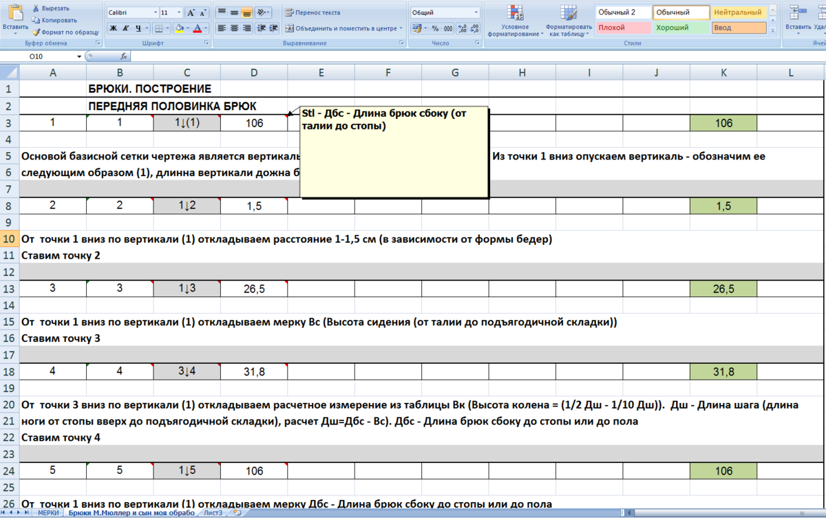 Текст взят из разработанной мной таблицы в Excel с работающей математикой. Вам надо подставить в таблицу ваши мерки и Вы получите таблицу с готовыми расчетами для построения и подробным описанием последовательности действий. Попробуйте построить брюки без рисунка следуя описанию. Рисунок приложу в последней части. БРЮКИ. ПОСТРОЕНИЕ ПЕРЕДНЯЯ ПОЛОВИНКА БРЮК Таблица: Мерки и измерения. Взяты из книги по построению. К сожалению, в простом тексте наглядность гораздо хуже, чем в таблице Excel. Часть первая. Пункт 1. точка 1. отрезок 1↓(1). Отложим 106 см. Основой базисной сетки чертежа является вертикаль, для её построения ставим точку 1. Из точки 1 вниз опускаем вертикаль - обозначим ее следующим образом (1), длина вертикали должна быть не менее длины брюк. Пункт 2. точка 2. отрезок 1↓2. расстояние 1,5. Отложим 1,5см. От точки 1 вниз по вертикали (1) откладываем расстояние 1-1,5 см (в зависимости от формы бедер) С