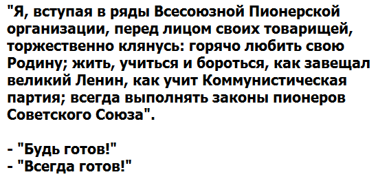 Такую клятву давали (если запоминали) будущие пионеры на торжественной линейке по случаю приема в ряды понерской организации. Обязанности пионера включали в себя множество общественно полезных дел. Кто не был предан Родине, партии, коммунизму, кто не собирал макулатуру и металлолом, не помогал переводить бабушек через дорогу, не читал пионерскую правду, не защищал младших, тот точно не мог считаться пионером. Пионер, как известно, всем пример. Тест: Спасибо за внимание. Ваши комментарии приветствуются и поощряются!