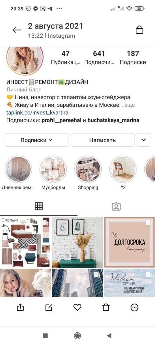 В июле обратилась клиентка с задачей: она закрывала аккаунт с накрученными подписчиками и открывала новый. Тема блога - инвестиции в недвижимость и ремонт (хоум-стейджинг) под сдачу в суточную аренду в г. Москва. Задача стояла набрать больше 1000 подписчиков для участия в качественных взаимопиарах с одной стороны и с другой подписчики должны быть целевыми, так как конечная цель блога - продавать консультации по подбору недвижимости в г.Москва и услугу хоум-стейджинга для подготовки объекта к аренде или перепродаже. Когда мы начали работу в блоге уже были подписчики с предыдущего аккаунта. Так как текущая тема блога была ремонт в инвест-недвижимости (хоум-стейджинг) в г. Москва решили выбрать аудиторию по геолокации - кто живет или часто бывает в Москве с сужением на интерес инвестиции-недвижимость. Сложным в работе было выбрать цепляющую фотографию и в рекламном тексте объяснить что такое хоум-стейджинг, т.к. он подразумевает, не просто дизайн, а ремонт, оборудование и декор.