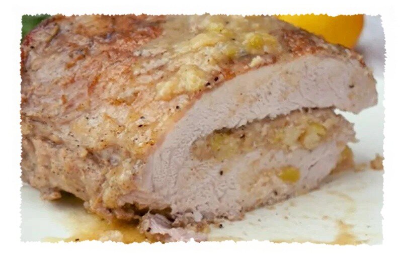 1 кг свинины (шейка), 50 г майонеза, соль, молотый черный перец, чеснок по вкусу. Для начинки: 3—4 китайских яблочка или 1 большое красное яблоко, 200 г яблочного пюре, 2—4 шт. кураги. Мясо обмыть холодной водой, обсушить, натереть солью и перцем, нашпиговать чесноком по вкусу. Завернуть в пергаментную бумагу и положить в холодильник на 3—б часов. Яблоки и курагу промыть, мелко нарезать, соединить с яблочным пюре, перемешать. После того как мясо слегка замаринуется, острым соком сделать глубокий продольный надрез, внутрь поместить начинку, соединить края надреза. Смазать поверхность мяса майонезом, обернуть его в фольгу и уложить на противень. Запекать в предварительно нагретой до 200'- 220” в духовке около 1 часа. Перед подачей нарезать ломтями, посыпать зеленью петрушки. Гарнировать клюквой, клюквенным желе.