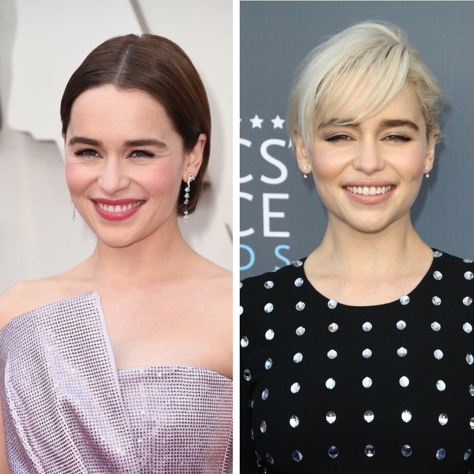 От природы у Эмилии Кларк тёмные волосы, однако прославилась она по роли светловолосой Дейенерис Таргариен в сериале «Игра престолов». Актриса признаётся, что первые годы поклонники даже не узнавали её без парика и очень удивлялись, когда видели её естественный цвет волос. Несколько лет назад звезда решила сменить имидж и перекрасилась в платиновую блондинку. Трудно сказать, сказать какой цвет идёт ей больше, но поклонники считают, что блонд больше украшает актрису.