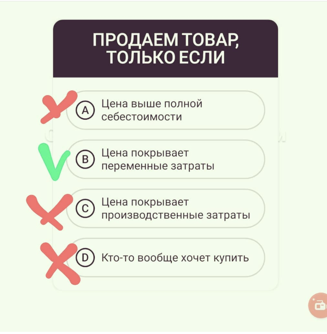 Так, вот, бизнес идет не очень, у вас есть возможность произвести товар и продать его. Но у вас нашелся только один покупатель, он хочет купить 10 единиц товара и только по цене 6 рублей.