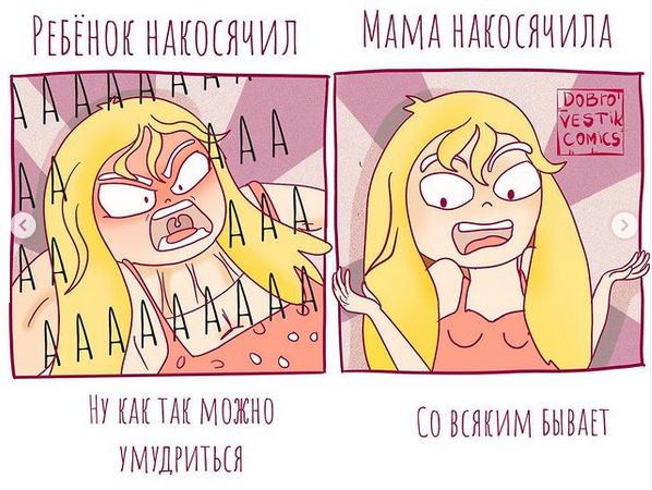 Это все же не моя семья, но очень похожая на нас. В комиксах часто пользуешься приемом гиперболизация, кое-где что-то приукрашиваю, чтобы было смешнее. В комиксах я чаще всего рисую одного ребёнка, хотя у меня два. Это сильно экономит время. Так проще вести блог. Сразу снимаются все вопросы от родных и стоит внутренний фильтр от негативных комментариев.