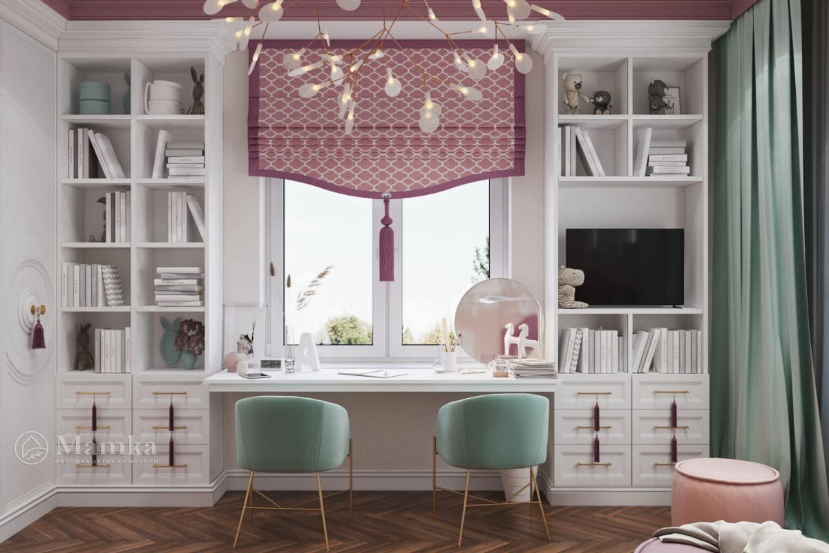 Светлая спальня для двух девочек с удобной спальной зоной. Мебельная фабрика Mamka позаботится о том, чтобы мебель в комнате была функциональной и красивой. Фото на сайте Этот дизайнерский проект доказывает, что даже небольшую комнату площадью 14,4 м2 можно обустроить функционально и красиво. Главное – правильно выбрать мебель. Для этой спальни вся мебель дизайнерская и выполнена фабрикой Mamka под индивидуальные параметры. Спальная зона отделена от остальной комнаты перегородкой. Тут установлены две кровати с высокими мягкими спинками, на которые можно опереться, словно на подушку. Радом с каждой кроваткой расположены миниатюрные тумбочки с выдвижными ящиками. Атмосферу сказки и волшебства в зоне отдыха создает декоративная панель замок с объемными башнями и подсветкой. Конструкция выполнена в белоснежных и розовых цветах. Практично обустроена рабочая зона. За письменным столом с удлиненной столешницей девочки спокойно поместятся вдвоем. Справа и слева от столика расположены вертикаль
