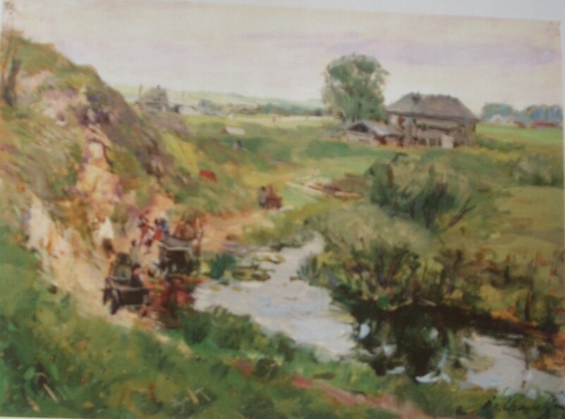 Первую выставку своих работ маленький Володя устроил дома. В прихожей, вместе со старшей сестрой Наташей они развесили более десятка рисунков, выполненных цветными карандашами. Здесь были и перерисовки с картинок из журналов, и рисунки по памяти (лошади Воронко, Пеганко, заяц, двоюродный брат Ваня). Яркие детские впечатления о своей малой родине художник описал в своей книге «Глазами сердца». «Счастливейшим событием всегда было то, когда отец брал меня с собой, направляясь на Петровскую мельницу, а еще когда ехал на базар или на ярмарку в Аскино, вот уж где можно было наглядеться на разные разности. А сама дорога! Едем то лесом, то полем, по холмам, по оврагам, пока не выедем на большой тракт. Слева и справа от широкого тракта стоят шумящие листвой столетние дубы и березы, через лога и овраги проложены крепкие мосты. Еще не выехали на Белую гору, как впереди над дорогой показался купол церкви с блестящими на солнце крестами, а через минуту с горы уже видно почти все Аскино, его улицы и отдельные высокие тополя в палисадниках и светлую ленту реки. Далеко за село уходят поля, засеянные хлебами, слева их обрамляют высокие холмы белоснежными березами Петровского леса, а справа от речки поднимаются на высокую гору хвойные леса Вакутинского… Аскино… как ты манило к себе мою детскую душу, сколько было в этом слове таинственного очарования, каким ты казалось большим, красивым и многолюдным».1 Разве это не пример словесного пейзажа? Позже, во время учебы в институте, эти впечатления детства воплотятся в картине «Село Аскино с Вакутинской горы» (1947 г.).