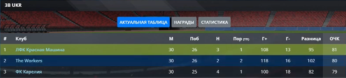Всем привет, с вами Коля Футболист! Пару дней назад в FootballTeam завершился уже 12-ый игровой сезон. Моя команда “ЛФК Красная Машина” играла в Украинской Лиге 3B, где на протяжении всего сезона наша команда сражалась с другими командами за первое место и кубок. Кроме того, что призовые места в лиге награждаются медалями и паками энергии, самое главное - первые два места переходят в лигу выше в нашей ситуации это Украинская 2A Лига. А в высшей лиге возможность поиграть с сильным ребятами, набить себе популярность, а также заработать намного больше для улучшения своего персонажа! Самые большие страсти накалились именно в последнем туре, перед которым мы находились на первом месте. Прямо снизу от нас остановилась команда “ФК Карелия” с отставанием в 2 очка и сильные “The Workers” с 3 очками позади, но лучшей статистикой в разнице забитых-пропущенных мячей. В последнем матче лиги, мы как назло играли с Карелией, так еще и у ни дома, что даёт им преимущество! Таким образом эта игра могла