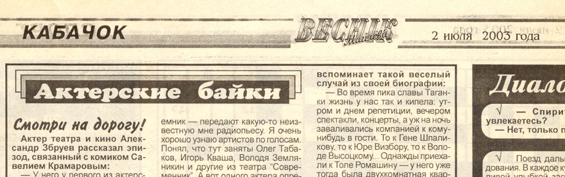 В номере газеты «Веснiк Магiлёва» («Вестник Могилева») от 2 июля 2003 года были опубликованы три маленькие истории, рассказанные артистами Борисом Хмельницким, Вячеславом Невинным, Александром Збруевым – «Актерские байки». Маловероятно, что это был эксклюзивный материал газеты, а каков его первоисточник в газете не указано. Тем не менее, в других изданиях эти истории мне не встречались, а истории забавные. Итак, «Актерские байки» Смотри на дорогу! Актер театра и кино Александр Збруев рассказал эпизод, связанный с комиком Савелием Крамаровым: — У него у первого из актерской братии появилась автомашина-иномарка: маленький "Фольксваген”, похожий на жучка. Водил Савелий ее очень странно, глядя не прямо перед собой, а как-то вбок. Когда я с ним только познакомился и сел в его авто, признаюсь, было немного жутковато — казалось, он вот-вот куда- то врежется. “Смотри на дорогу!” — постоянно напоминал я. “Так я на нее и смотрю!” — удивлялся Крамаров и снова глядел вбок. Когда наконец он затормо