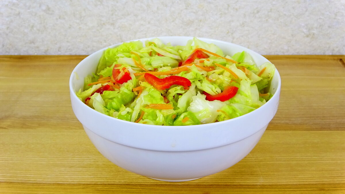 Огромное количество рецептов из капусты существует. У всех есть свои, полюбившиеся салаты и закуски. Но всегда хочется попробовать чего-то новенького и неиспробованного. Хочу предложить вам сегодня салат–закуску из обычных и доступных продуктов. Интересно? Приглашаю ко мне на кухню, где я покажу и расскажу, как приготовить салат–закуску из капусты. ВИДЕО РЕЦЕПТ: ПОШАГОВЫЙ РЕЦЕПТ С ФОТО: Разрезаю кочан капусты на четыре части и удаляю кочерыжку. Каждую часть нарезаю на крупные кусочки. Выкладываю в глубокую миску, разделяя листики. Соломкой нарезаю красный перец и добавляю в миску. Можно брать перец любого цвета, но как по мне, он лучше всего смотрится в готовом блюде. Морковь тру на терке для корейской моркови. Если ее нет, используйте обычную терку. Добавляю соль к овощам и перемешиваю. Немного приминаю капусту. Нарезаю мелко лук и выкладываю в разогретую сковороду с подсолнечным маслом. Готовлю лук, помешивая, до момента, пока он размягчится. Добавляю к луку зиру и помешивая готовлю