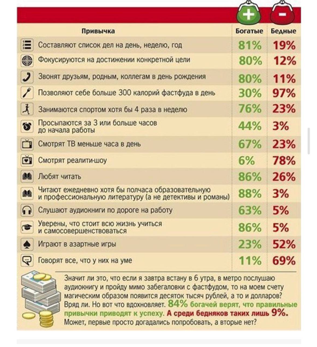 В силу своего воспитания, окружения и привычек у каждого из нас своя картина мира. 😉 Отличается и мышление. Проверьте, а какое у вас мышление на данный момент: как у богатого человека или как у бедного? Для этого оцените свои привычки из таблицы ниже ⤵️ Деньги – это энергия, которую нужно уметь принимать. Вспомните, какие эмоции вы испытываете, когда получаете зарплату? 😉 "Классно, деньги пришли" или "Ну вот, и что я могу купить на эту з/п?" и начинаете мысленно перечислять, сколько и куда вам нужно отдать? Увеличение капитала должно сопровождаться положительными эмоциями. Природа всем нам дала внимание, память, мышление, однако материальное благополучие у всех разное. Конечно, не только семья и окружение влияет на количество денег в нашей жизни. Влияет на изобилие и внутреннее ощущение себя — чем меньше человек себя любит, ценит свои профессиональные качества и умения, тем меньше вероятность, что он когда-то разбогатеет. Отсюда к вам вопрос: насколько вы любите себя и какая у вас