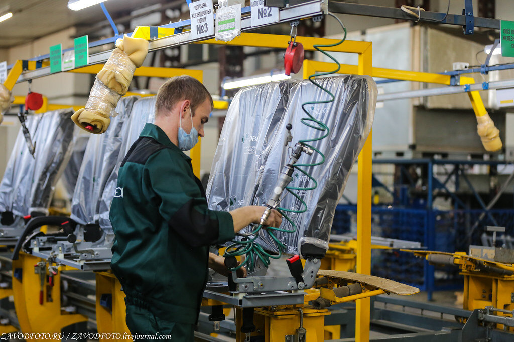 На предприятии предусмотрены два конвейера со сменными стапелями для сборки пассажирских сидений. Всё очень удобно и продуманно, переставил стапель и уже работаешь над другой моделью.
