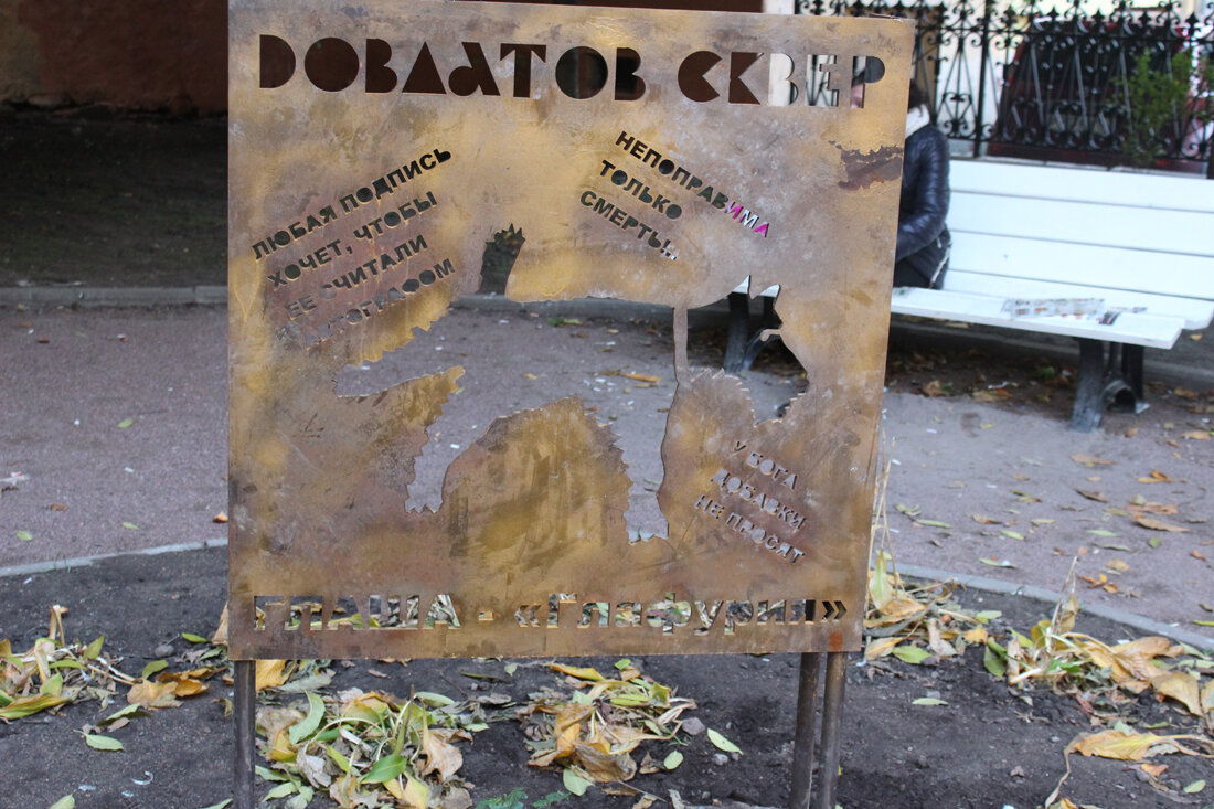 Композиция «Довлатов сквер. Глаша – “Глафурия”». Была открыта 4 сентября 2021 года в Петербурге - в сквере Довлатова на Загородном проспекте, между домами 15 и 17. Автор Вячеслав Бухаев. Ошибочное представление о том, что Сергей Довлатов – это писатель масштаба Иоисфа Бродского и Александра Солженицына и вместе с ними «входит в тройку наиболее известных на Западе русскоязычных авторов второй половины XX века» (цитата отсюда), привело к тому, что желание сделать «День Д» (праздник в честь Довлатова) вечным закономерно привело инициаторов к установке типично мусорных, мизерабельных и по содержанию, и по форме объектов. Инициаторы хотят все время добавлять. Потому-то к статуе Довлатова на ул. Рубинштейна (у д. 23) сначала добавился столик с пишущей машинкой, а теперь еще и изображение любимого фокстерьера писателя Глаши, установленное в сквере Довлатова на Загородном пр., получившем это наименование в апреле 2018 года. Естественно, что процесс деградации довел до производства скобяных из