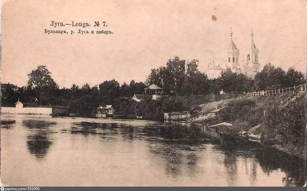 Начинаем прогулку по городу с моста через реку Луга. Как ни странно, но название реки никак не связано с лугами. Произошло от эстонского слова laugas, что означает болото, яма, углубление. В бассейне реки множество болот, так что название вполне логичное. Но вернемся в одноименный город и посмотрим на берег реки 100 лет назад.