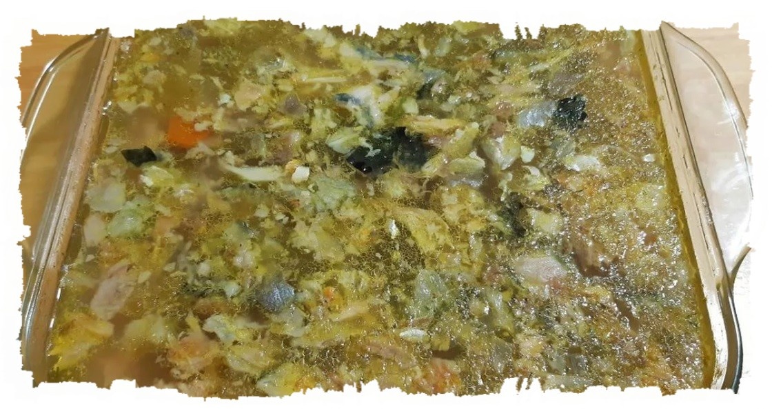 Головы осетровых рыб 100, или тушки рыбы (судак, налим, щука, стерлядь и др.) 100, или пищевые рыбные отходы, либо рыбная мелочь 100, желатин 3, петрушка 8, лук репчатый 8, морковь 8, перец, лавровый лист, хрен готовый 40, соль 4. Кости, плавники и чешую, которые остаются от разделки рыбы, промывают, заливают холодной водой (на 1 кг отходов – 1 л воды), добавляют морковь, лук, петрушку и варят на слабом огне в течение 1–2 часов, периодически снимая пену и жир. В конце варки кладут лавровый лист и перец. Можно сварить бульон из рыбной мелочи (ерша, пескарей, окуньков и др.). Студень можно варить из голов любой осетровой или частиковой рыбы. Для этого головы ошпаривают, разрубают вдоль, промывают, варят в бульоне в течение 1–2 часов вместе с рыбными отходами, а затем отделяют от них мякоть. Рыбу чистят, потрошат и тоже варят в бульоне. Готовый бульон процеживают и еще раз кипятят, затем охлаждают. В стеклянные салатники или вазы кладут мякоть рыбы, рубленые вареные хрящи или мякоть, снят