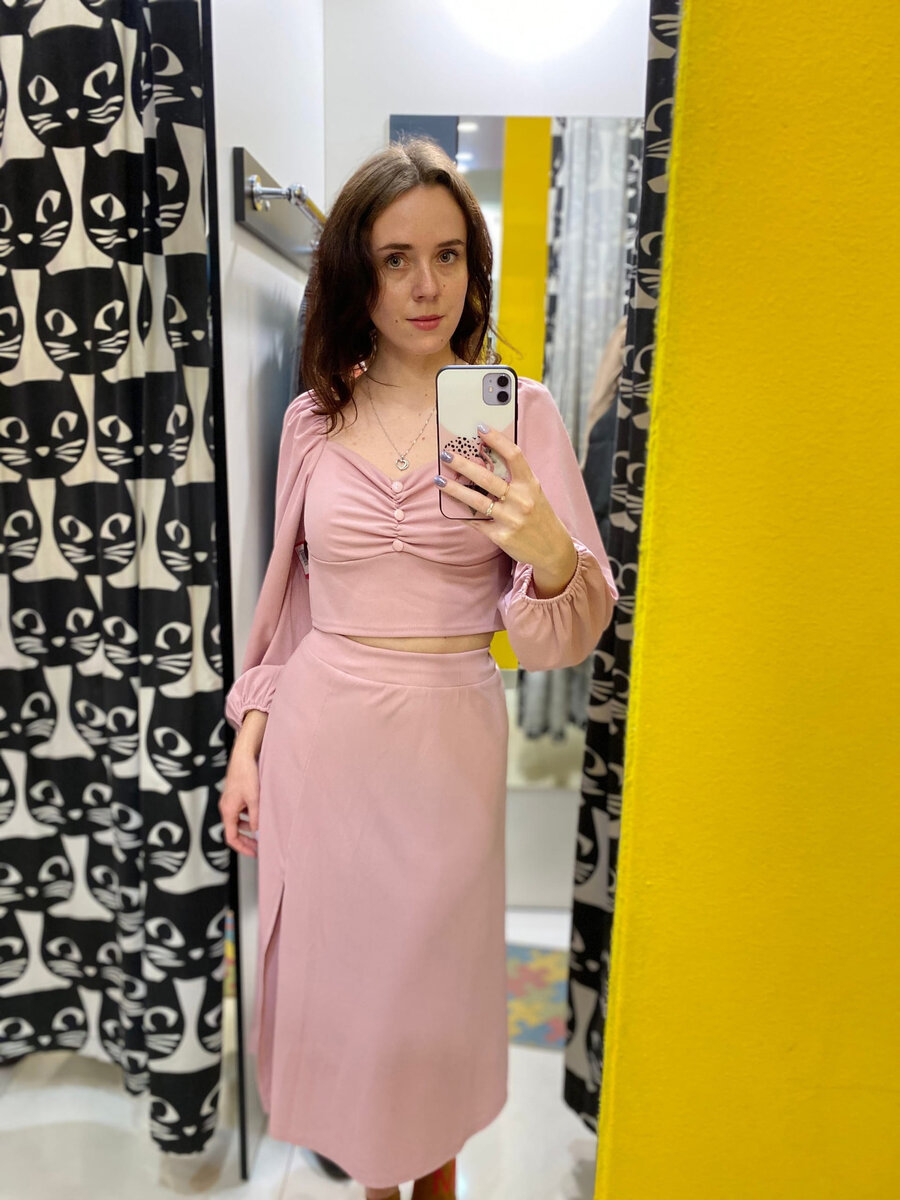 В последнее время часто слышу о том, что стала какой-то неженственной. Может, так оно и есть, слишком уж удобной мне показались спортивные костюмы, худи, джинсы. Я и раньше подобное любила, но чередовала с юбками и платьями. Теперь вот как-то не хочется носить подобную одежду, да и можно скрыть фигуру под вещами свободного кроя. Впрочем, решила я, прогуливаясь по городу, наведаться в мой любимый магазин. Хотела присмотреть там джинсы, но в итоге спонтанно пожелала примерить комплекты из блузки и юбки. Я на них ещё месяц назад заглядывалась, но не брала, так как знала, что вряд ли потом буду носить. Теперь вот стало интересно, будут ли такие вещи смотреться на мне лучше, чем спортивные костюмы. Взяла комплекты розового цвета, максимально женственные, нежные. Покажу и вам каждый из них. Первый комплект: летний Мне кажется, что он подойдёт именно на лето, потому как ткань лёгкая, с тёплой одеждой сочетаться не будет. Смотрится интересно, но есть огромный минус, о нём чуть позже расскажу.