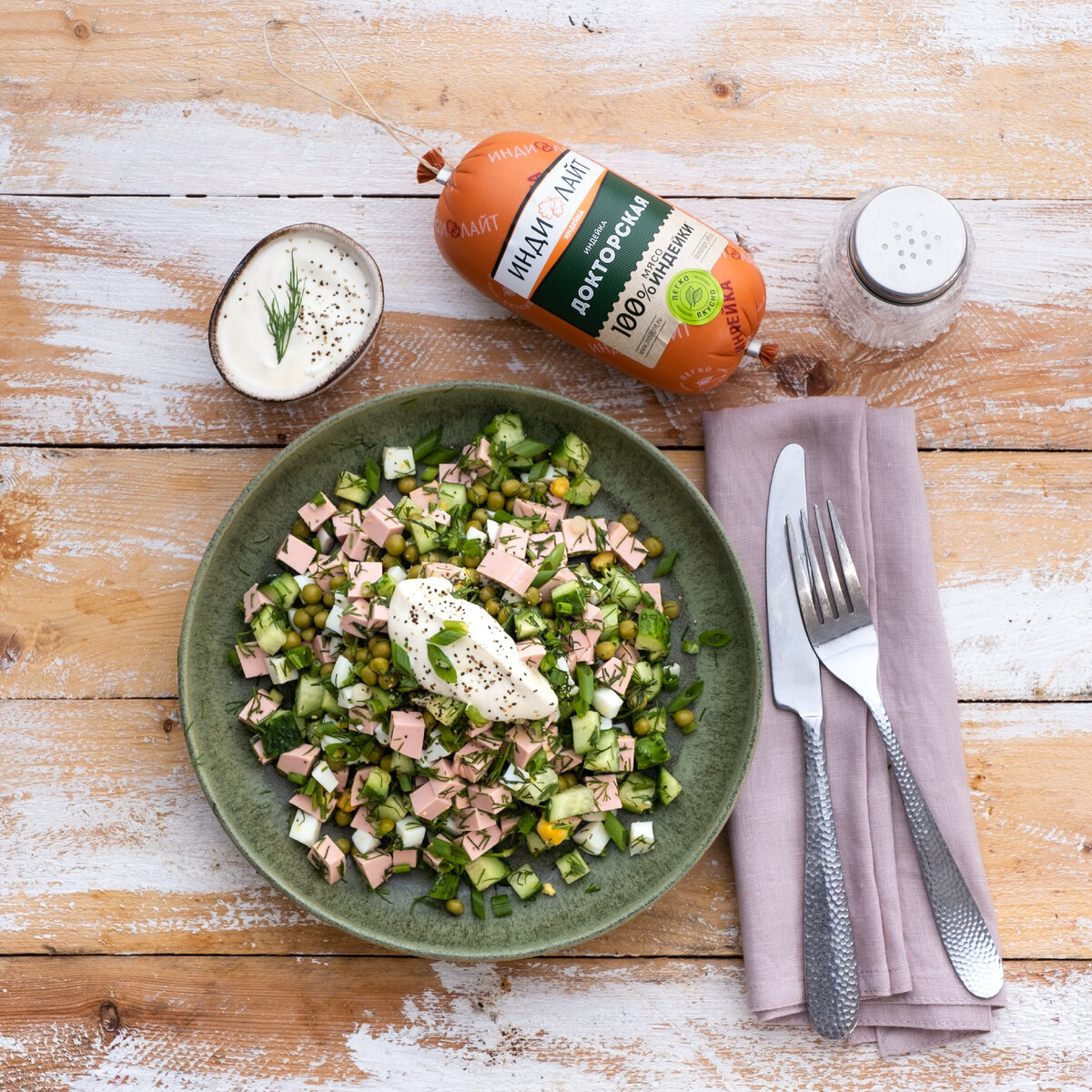 Уже начали предвкушать зимние праздники? Мы тоже! Сегодня готовим салат с нежной "Докторской" колбасой из индейки, свежими огурчиками и нежной сметанной заправкой. Попробуйте, возможно, вам понравится больше, чем классический оливье! 200 г колбасы докторской Индейка «Индилайт» 200 г консервированного зеленого горошка 2 яйца 2 огурца 120 г сметаны 1 ч. л. горчицы 2 пера зеленого лука 2 веточки укропа соль, свежемолотый черный перец Положите яйца в небольшой ковшик, залейте холодной водой, доведите на сильном огне до кипения и варите 8 мин. Залейте холодной водой и остудите. Очистите яйца от скорлупы и мелко порубите. Нарежьте огурцы и колбасу небольшими кубиками. Измельчите зеленый лук. Сложите все ингредиенты в салатник. Соедините сметану с горчицей и мелко нарезанным укропом, посолите, приправьте перцем и взбейте венчиком. Заправьте салат сметанным соусом, тщательно перемешайте и подавайте. Приятного аппетита!