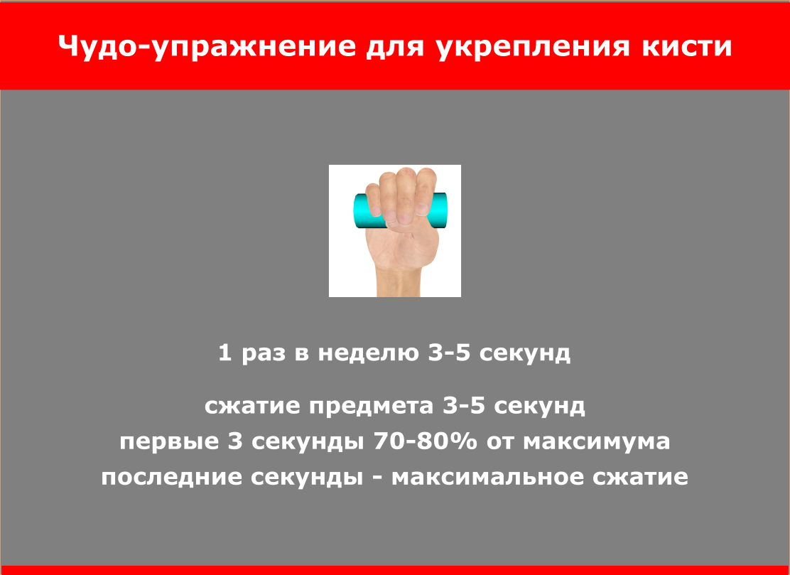 Это 5-е упражнение из выполняемых один раз в неделю, его мне также поведал мой хороший знакомый, о котором речь шла в прошлых статьях. Это упражнение позволяет улучшить свои результаты в силе хвата. Если у вас есть динамометр для измерения силы кисти, то вы можете использовать его, если его нет, можно использовать сложенное в несколько раз полотенце, теннисный мячик, эспандер, который вы не можете сжать (на 60, 90 кг), нераспакованный кусок мыла. Упражнение заключается в том, чтобы изо всех сил постараться за короткое время (в течение 3-5 секунд) сжать этот предмет и, не задерживаясь, расслабить руку. Упражнение выполняется по одному разу на каждую руку. Оно займёт у вас не больше 10 секунд. Первые секунды сжатия вы сжимаете сильно, а потом стараетесь сжимать ещё сильнее (с максимальной силой). Если после этого вы чувствуете, что можете ещё сильнее сжать руку в последнюю секунду, то сделайте это, потом сразу же расслабьтесь.