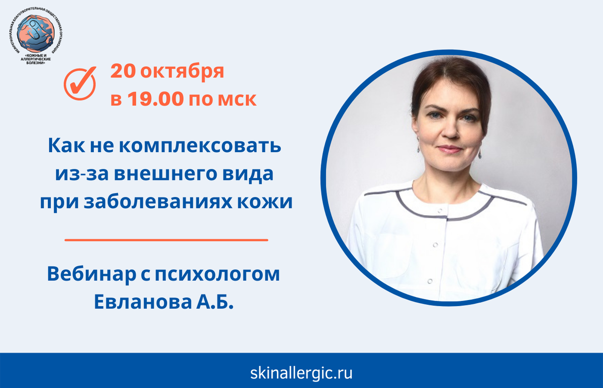 Кожные заболевания составляют значительную часть «болезней цивилизации. Как правило, дефекты на коже становятся объектом внимания со стороны посторонних людей. Многие начинают комплексовать и избегать общение, чтобы не привлекать к себе внимание. Особенно сложно детям и подросткам, т.к. в силу физиологической перестройки организма, помимо комплексов могут присоединяться психосоматические проблемы. Как научиться правильно воспринимать свое тело при кожных заболеваниях? Как перестать комплексовать и убрать тревоги и страхи? Мы разберем на бесплатном вебинаре с медицинским психологом Евлановой Анной Борисовной. Тема: «Как не комплексовать из-за внешнего вида при заболеваниях кожи». Вебинар состоится 20 октября (среда) в 19.00 по мск. Ссылка на мероприятие: https://pruffme.com/landing/u736639/tmp1634387379 Проводит вебинар психолог Санкт-Петербургского «Городского Кожно-венерологического диспансера» Евланова Анна Борисовна. Анна Борисовна с 2007 года работает в КВД с пациентами с кожными п