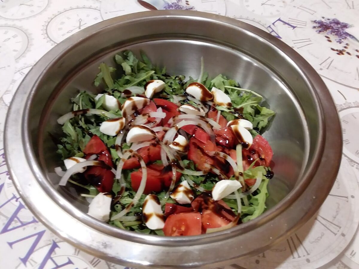 На днях зашла в пиццерию. В меню красовался салат. Снимок вызывал обильное слюноотделение. Но цена кусалась: 270 рублей за 100 грамм. Честно скажу: «жаба задушила» брать его. Но от этого салата меньше хотеться не стало. Зашла в магазин и купила: пачку моцарелла (мелкими шариками), салатную луковицу, рукколу, помидорку Бальзамический крем и оливковое масло имелись у меня дома. Приехав домой, осталось собрать салат. В миску положила рукколу, каждый кусочек моцареллы порезала на четыре части, лук полукольцами, помидор мелкими дольками (если бы были томаты черри, то их бы порезала пополам). Точную пропорцию указать не могу, так как делала на глаз. Всё полила бальзамическим кремом и оливковым маслом. Соль добавляется по вкусу. Прикинула себестоимость… Примерно 30 рублей порция. Причём в моём случае было около 150 грамм. Приятного аппетита! Кстати, я являюсь администратором группы: "Каша из топора или записки дачного кулинара". Её название говорит само за себя. Кулинарных групп на сайте вел