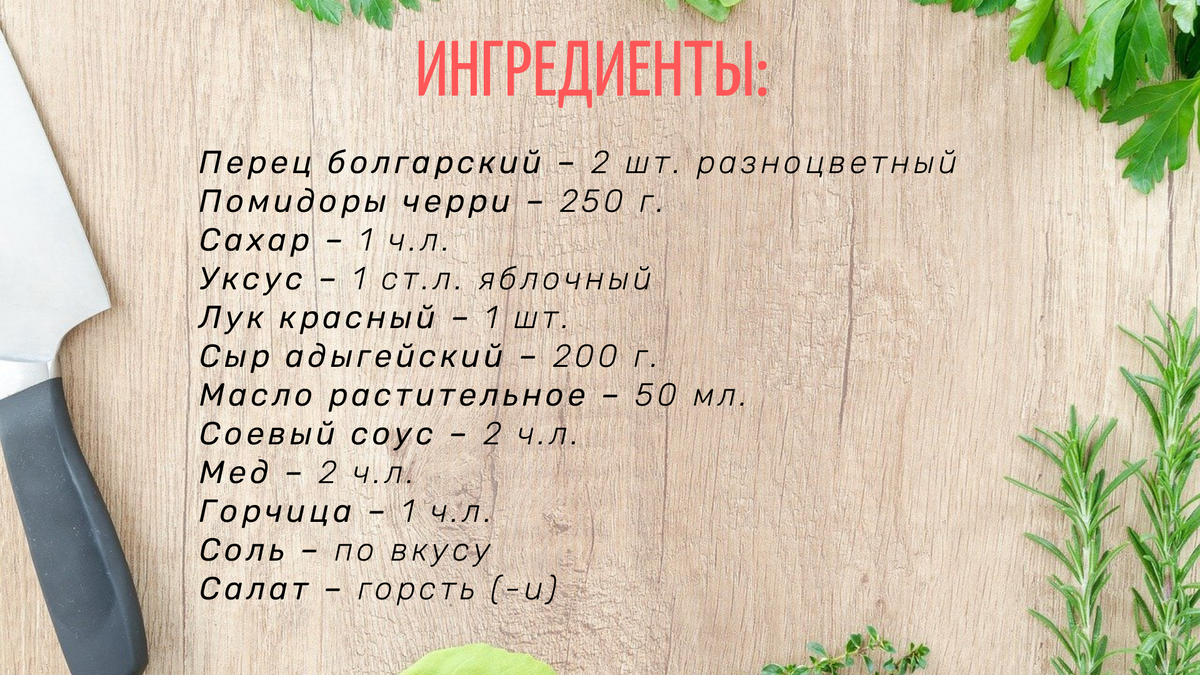 ⏰ Общ.\актив. время готовки: 30 минут\10 минут 🍴 Количество порций: 2 порции ✳ Калорийность (100g): 140 ккал 💰 Стоимость: средняя стоимость Попробуйте приготовить классический салат из помидор и перца, но сыром придать ему нотку пикантности и аромата. Приготовление: Если вы хотите, чтоб ваш салат получился ярким, то берите разноцветные болгарские перцы. Черри можете заменить на простые помидоры/ Если не найдёте сыр халуми, то замените на адыгейский сыр. Этап 1 - Перец очистите от перегородок и семян; - Порежьте на 4 части; - Выложите четвертинки на фольгу; - Перец сверху сбрызнуть ст. л. растительного масла и посолить; - Перемешайте руками. Этап 2 - Разогрейте сковородку (если есть гриль, лучше используйте её для получения поджаристых полосок); - Выложите на сковородку перцы; - Обжаривайте по 3-4 минуты с каждой стороны; - Переложите готовый перец обратно на фольгу и заверните на пару минут. Этап 3 - Порежьте помидоры: черри пополам, если большие на четвертинки. - Красный лук порежьт