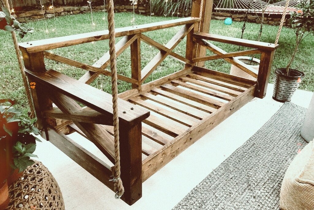 Самая часто спрашиваемая статья в блоге. Сегодня будем строить качели для всей семьи. Я всегда хотел иметь их на крыльце нашего двора, но не хотела платить за них большие деньги! Мы с женой сделали проект за несколько выходных, и я не могу быть ещё счастливее! Мы построили эти качели на основе размеров небольшого односпального матраса. Вы также можете сделать эти качели в маленьком размере, используя матрас для детской кроватки. Материалы для строительства качелей: Необработанная сосна: Другие материалы: Шурупы, 4 болта с проушинами из нержавеющей стали, 1 веревка, морилка, полиуретан на водной основе, гвоздодёр для оплетки, большие черные эстетичные шурупы для дерева, которые мы добавили просто для вида. Инструкция Ознакомьтесь с приведенными выше планом, следуя инструкциям 1) Разложите базовую рамку 60×180. Просверлите и прикрутите его вместе двумя 4-дюймовыми шурупами в каждом углу. 2) Отрежьте и прикрепите внешние плинтусы размером 60×180 с помощью гвоздя или дрель. Закрутите 2-дюй