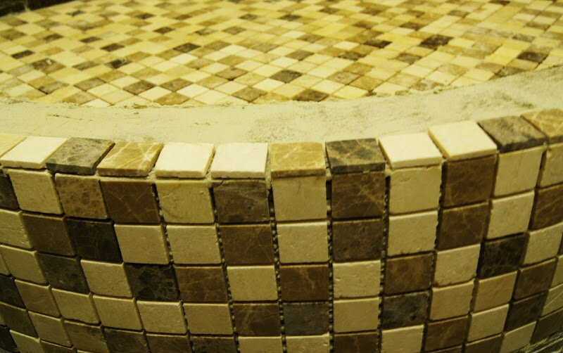Вопрос неоднозначный. Вообще ванну исполнял не я. Был приглашен на переделку поддона и установку душевого уголка. Сам поддон максимально испорчен, помимо качества облицовки забыт уровень слива: так, что вода просто скапливалась на стыке дуги и днища. Первым делом отметил места примыкания к стен будущего каркаса. Сбил плитку. Не понимаю - как люди рассчитывают увидеть идеальный полукруг из плитки? Это же невозможно, любой восьмиклассник шарящий в геометрии подтвердит. Слои гидроизоляции под клеем просматриваются, это радует. Пришлось заменить две плитки на месте примыкания к стенам нижней дуги. Определил толщину слоя у слива (а это, естественно - ноль и низшая точка) чтоб мозаика примыкала вровень. Посадил маяки на плиточный клей. Теперь к диаметру сажаю на ребро согнутый маяк. Вообще можно и толстый электрический кабель загнуть, вариантов много. Задача поднять общий уровень по диаметру так, чтобы прямая от каждой точки, пущенная к сливу имела одинаковый наклон. Для этого достаточно 1 с