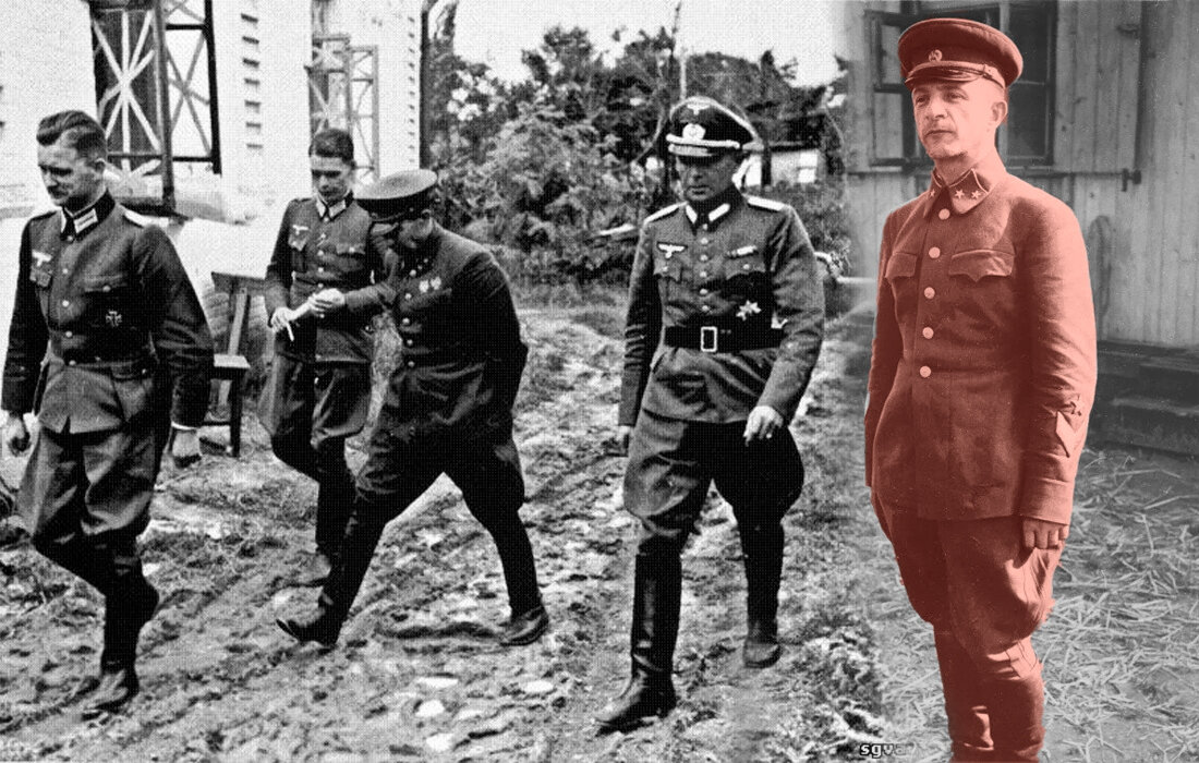 Генерал-майор Рихтер имел немецкое происхождение (отец – русский немец, мать –русская). Но вряд ли он свободно владел немецким языком. На фотохронике видно, что после пленения Рихтер общается с немецким офицером через переводчика.