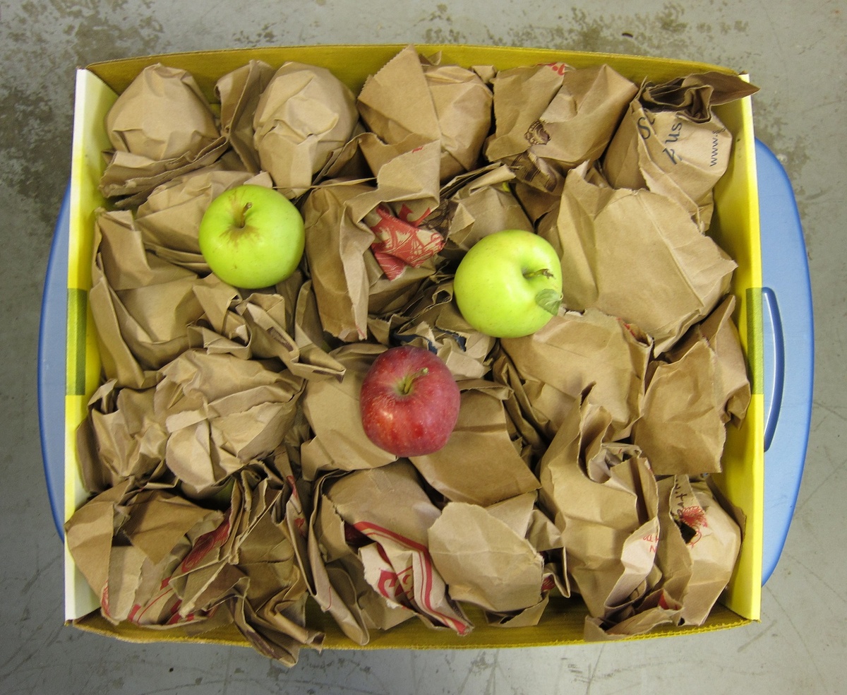 У родителей в саду росло 5-6 яблонь и все они "Антоновки". Все лето их даже откусить невозможно - кислые, зато потом до весны ели свои яблочки. К новому году они уже становятся мягкими и в меру кислыми. Самое то для гуся с яблоками на новогодний стол. До сих пор помню, каким вкусным получалось фирменное блюдо мамы. Тогда еще духовок не было, готовили в большой деревенской печи. Когда зимой все мечтали о свежих яблоках, мы могли себе позволить лакомиться ими хоть каждый день. Потому что яблоня всегда щедро одаривала нас плодами. Главное правильно все сделать, чтобы яблочки не испортились. А это целый ритуал. 1. Для начала надо собрать яблоки до тех пор пока она упадут на землю. Бережно срывать, стараясь не повредить фрукты и сложить в коробку или ящик, подойдет любой. Главное, чтобы тара была чистой и сухой. После сбора яблок, у нас обычно выходило коробок 8-10, оставить все на улице, но не под открытым солнцем и дождем. Через пару дней перебрать, если есть почерневшие, погнившие