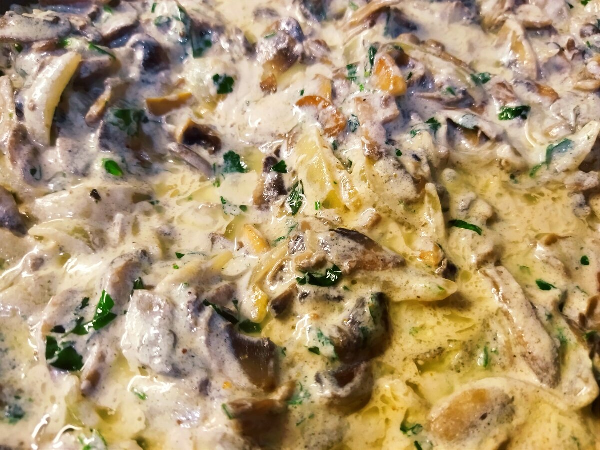 Жаренные шампиньоны с луком и зеленью в сметане.