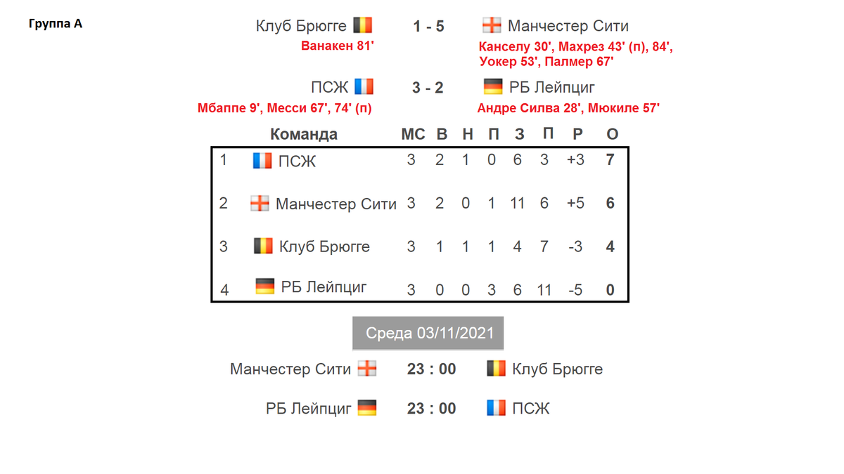 ПСЖ набирает 7 очков (2 победы и 1 поражение). Манчестер Сити имеет на 1 очко меньше. У Брюгге – 4 очка после 3 игр. Лейпциг - кандидат на вылет. Клуб проиграл всем в первом круге.