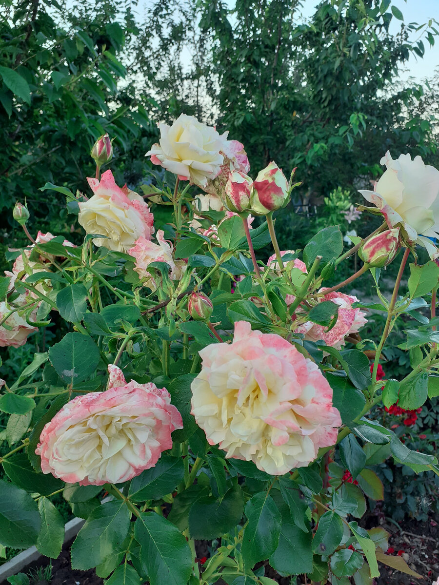 Вот такой примерно фон для роз мне нравится - чтобы позади был сад или газон, но пока у нас немного не так. На фото выше - наши розы. Это Атена, но она снята не с основной дорожки в саду. На самом деле дорожка проложена между розовой грядой и садом и когда заходишь в сад, то такого вида нет: сад - слева, а розы - справа. Перед садом ещё цветники с лилиями, пионами, астильбами, а вот за розами располагаются огородные гряды, которые , конечно, идеальным фоном не являются. Да и для лилий это место перед садом не совсем подходит - оно очень солнечное и лепестки быстро выцветают, а кроме того, большинство лилий пора рассаживать и , конечно, лучше на другое место. Совсем недавно я посадила между деревьями первого ряда в саду метельчатые гортензии и снова подумала, что с лилиями у них интересной композиции не получится. И тут мне пришла мысль насчёт расширения розария: лилиям найдётся другая клумба, а вот перед гортензиями на фоне сада прекрасно будут смотреться розы, особенно если они буд