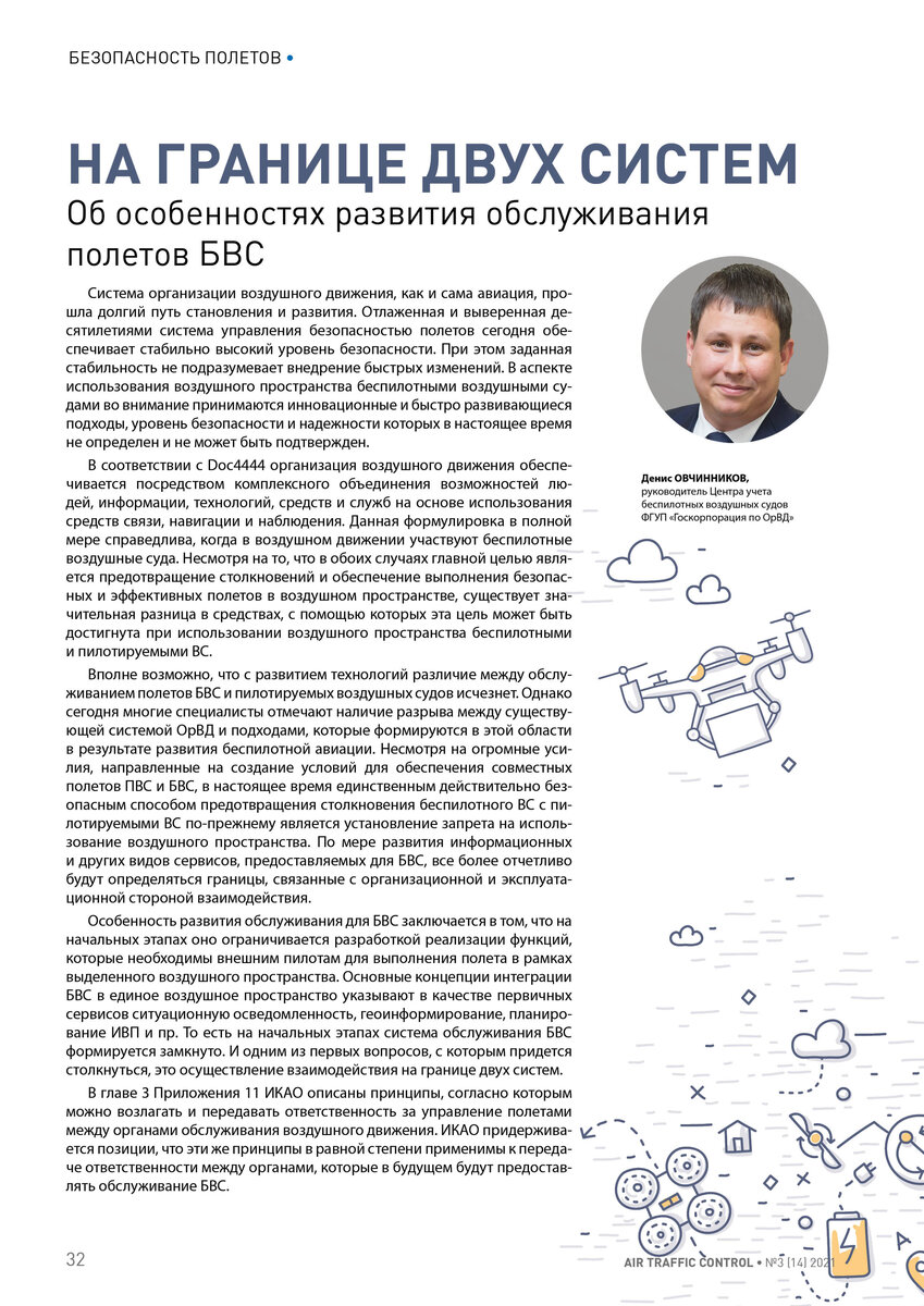 Предлагаем Вашему вниманию статью руководителя Центра учета беспилотных воздушных судов ФГУП «Госкорпорация по ОрВД» Дениса Овчинникова из нового номера журнала Air Traffic Control. В материале «На границе двух систем» речь идет об особенностях развития обслуживания БВС в текущей ситуации.
