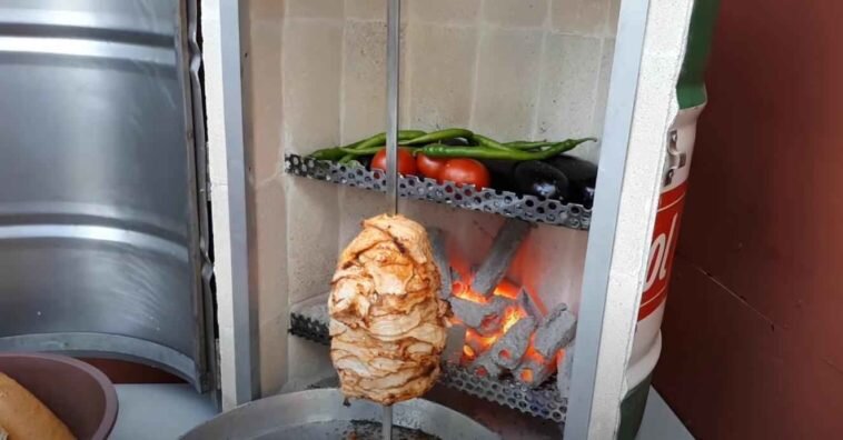 Берем болгарку с отрезным кругом, и прорезаем одну линию (по разметке). Затем на саморезы прикручиваем мебельные петли: две по краям и одну посередине линии. Дальше прорезаем остальные линии — в результате у нас получится дверца. Внутреннюю часть бочки (стенки и дно) обкладываем огнеупорным кирпичом. В крышке бочки необходимо высверлить отверстие, через которое будет выходить дым, а также сделать пропил для установки шампура. На следующем этапе из перфорированной металлической пластины вырезаем два полукруга, и устанавливаем в кирпичную стенку. На полки из сетки будут укладываться угли для