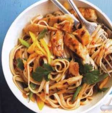 Жареное куриное филе подается с вареной рисовой лапшой и свежим болгарским перцем.
