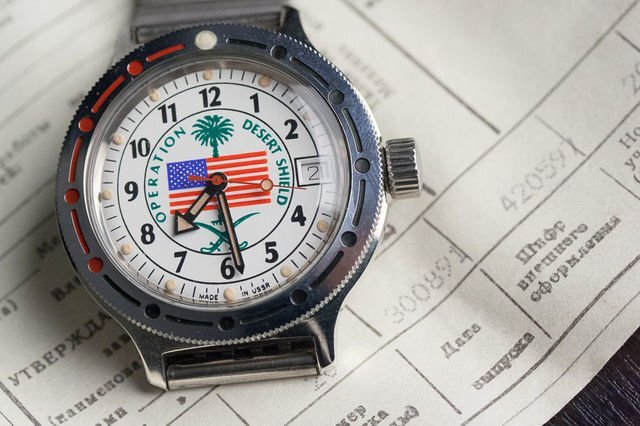 Здравствуйте, читатели нашего блога! Удивительная по нынешним меркам (и вполне обычная для времен перестройки и начала 90-х) история связана с часами Desert Shield. Сделаны они были в Советском Союзе, но предназначались для американских солдат, участвовавших в войне в Персидском заливе, если быть точным, в операции «Щит пустыни». Собственно, Desert Shield - как раз «Щит пустыни», эта же надпись красуется на циферблате часов, выпущенных Чистопольским заводом «Восток». По легенде, часы были специально заказаны Пентагоном у «Востока» - чтобы награждать (или просто выдавать) их военнослужащим. Разумеется, это не так. Проект «Часы Desert Shield» был частной и коммерческой затеей американского бизнесмена Брюса Эриксона. Эриксон решил извлечь выгоду из патриотической темы, с одной стороны, и моды (правда, на тот момент уже затухавшей) на все советское. Он учредил компанию Timepeace Russian Watches и зарегистрировал торговую марку Vremir - специально для продажи российских часов в США. Сле