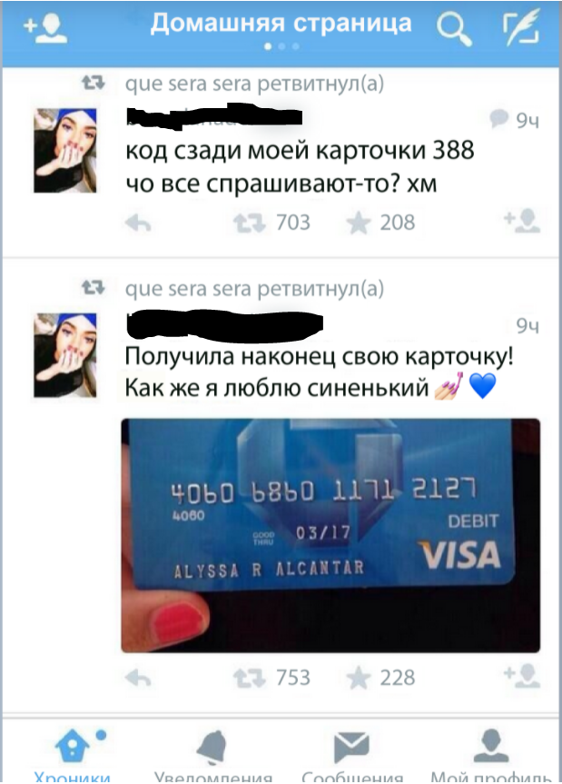 С социальными сетями могут быть связаны самые разные неприятности, а в большинстве случаев все начинается с "безобидного" поста. Как у девушки Алиссы, которая когда-то похвасталась в twitter фотографией только что полученной дебетовой картой, написав: «Наконец получила дебетовую карту! Как мне нравится синий цвет!» В комментариях ее спросили, какие три цифры написаны на обороте, и Алисса, не долго думая, ответила: «Код на обратной стороне — 388. А почему все спрашивают?». Вы уже догадались, что в тот же день у нее сняли все деньги: девушка сама предоставила всю необходимую для этого информацию. На самом деле, код с обратной стороны карты был не обязателен: есть интернет-магазины которые его совсем не требуют или просто вводят лимит на разовую сумму платежа. Перед публикацией любого поста нужно тщательно подумать. Вы сообщаете о долгожданном отпуске - и во время отсутствия вашу квартиру обворовывают. Вы публикуете свое фото - и вас увольняют с работы (кому-то оно могло показаться слиш