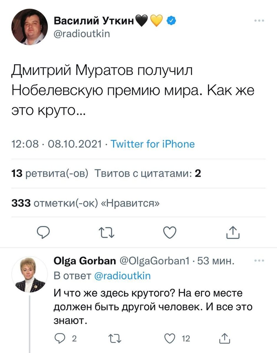 Сегодня великий день для российской журналистики - Нобелевскую премию мира присудили главному редактору "Новой газеты" Дмитрию Муратову. Дмитрий Муратов заявил, что данная премия не только его, но и коллег, которых уже нет с нами (6 журналистов "Новой газеты" поплатились жизнью за свои расследования). Также он заявил, что часть денег за премию (а это более 1 млн долларов) потратит на благотворительность - в фонд "Круг добра" (за это ему уже прилетело, так как фонд был создан по инициативе Путина). Новость же о присуждении Нобелевки вызвала удивительную реакцию. Большая часть журналистов (и оппозиционных, и провластных) поздравили Муратова и отметили, что это достижение российской журналистики. Тогда как огромное число сторонников Навального подвергли критике данное решение (на победу Навального давали 1 к 12). Для примера пост журналиста Василия Уткина (работал на "Эхо Москвы"): А вот как как в соцсетях люди реагировали на это событие. alexlitreev (о том, что Муратов для сторонников На