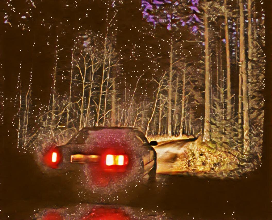 Уже начинало темнеть, когда мы выехали. Грунтовая дорога идёт лесом, а лишь потом можно выехать на трассу.