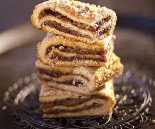 Ювелирная работа: слива перетирается в пюре, соединяется с грецкими орехами, а затем аккуратно заворачивается в тончайшие слои теста. Тут нужна определенная ловкость рук, но рецепт подробный, и каждое действие в нем описано. ИНГРЕДИЕНТЫ Пшеничная мука 2 стакана Сахар 1/2стакана Сливочное масло 50 г Разрыхлитель 1 чайная ложка Соль щепотка Очищенные грецкие орехи 130 г Куриное яйцо 3 штуки Консервированные сливы 350 г 1.Смешать муку, ¼ стакана сахара, сливочное масло, разрыхлитель и щепотку соли в кухонном комбайне. Добавить 2 яйца и ¼ стакана ледяной воды. Замесить тесто, обернуть его пищевой пленкой и положить в холодильник на 1 час. 2.Измельчить обжаренные грецкие орехи и оставшийся сахар в кухонном комбайне. 3.Сливы достать из сиропа и пюрировать блендером. 4.Разогреть духовку до 180 градусов. Из теста вырезать три части, каждую часть раскатать в прямоугольник размером 18×28 см (по форме для запекания). 5.Смазать форму сливочным маслом и выложить первый лист теста на дно. На него вы