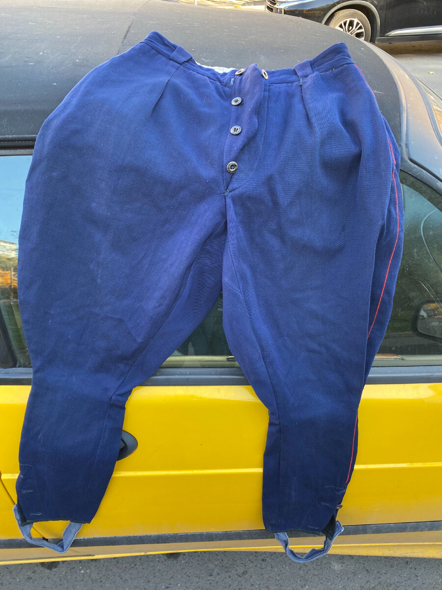 Вчера утром я с женой привёз сына в поликлинику на диспансеризацию. Высадил их у входа, а сам поехал искать место для парковки. Это оказалось сложной задачей. Рядом станция метро и многие паркуют свои автомобили, и едут на работу. Положение очень осложнилось тем, что повесили много запрещающих знаков по окрестным улочкам. Я ехал и ехал, а приткнуться было совсем негде. Меня это увело достаточно далеко от поликлиники, но местечко я в результате нашёл. Выхожу из машины. И тут вижу висят галифе. И рядом товарищ банки алюминиевые складывает в мешок. Я возбудился, потому что издалека они мне показались довоенными командного состава. Когда подошёл ближе, понял что милицейские 1950-х годов. Но тоже не плохо, учитывая что висят не в магазине или на развале. А здесь. Но на лицо присутствие «конкурирующей фирмы». Я вежливо полюбопытствовал по поводу штанов, не он ли их тут повесил… Думаю, деньжат немного дам если будет