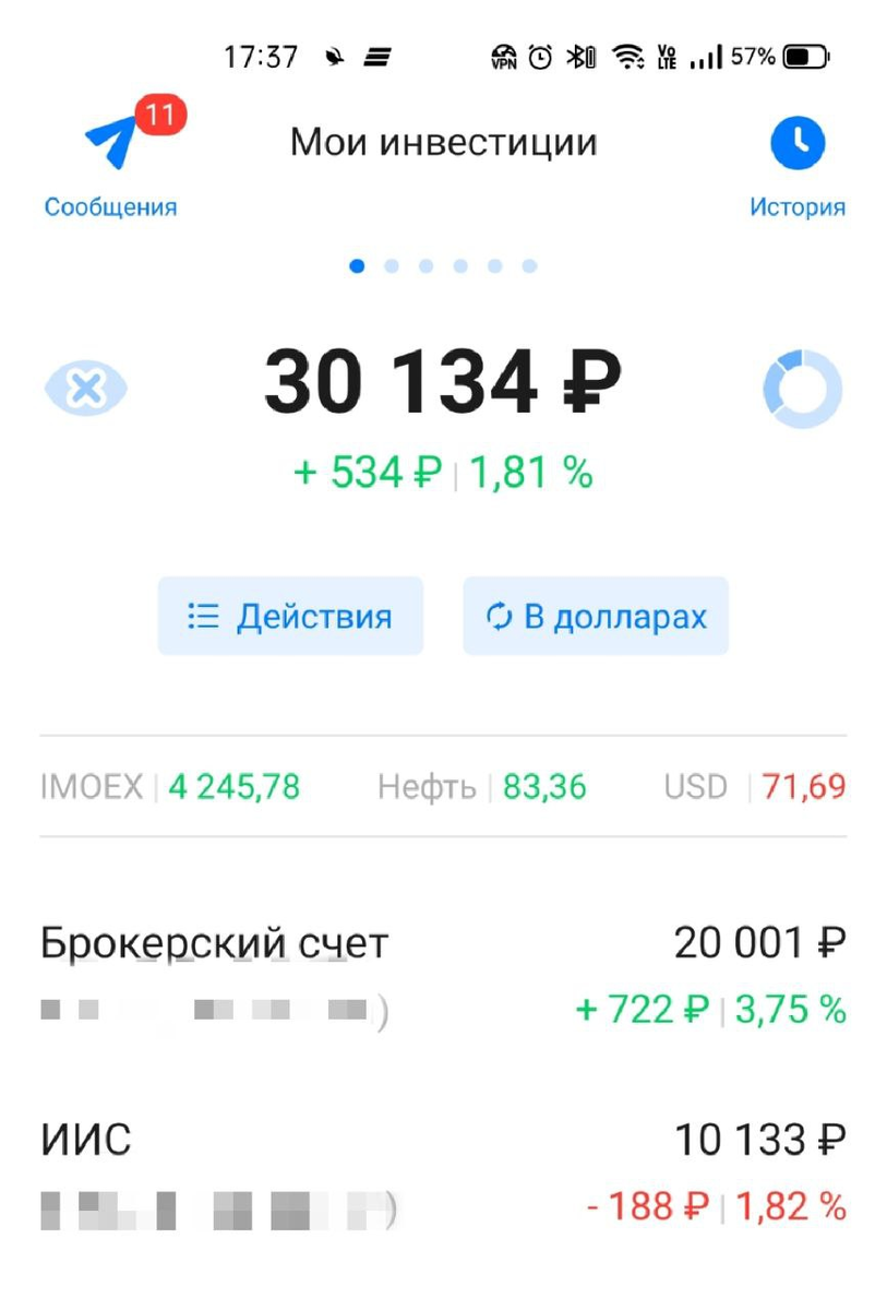 Старт был 3 августа, когда были открыты оба счета. За все время на 08.10 на брокерский счет внесено 21532,24 рубля, из них тут же выведено на ИИС 5000 рублей (не сразу поняла как закидывать деньги на ИИС). Короче, считаем: 16532,24 в рублях и 1.5 доллара за 2 месяца. На ИИС внесены 10200 рублей, ничего не выводилось. Немножко попытавшись покупать и продавать акции в августе, когда минусы на моем брокерском счёте заставляли принимать необдуманные решения, я решила только покупать, а продавать в самом крайнем случае - если случается какая-то жопа. За это время я успела толкнуть АФК Систему, одну из двух акций ПИК и многострадальный ENDO, который упал сразу после покупки так, что мне даже приснилось, что они разорились и разорили меня :) и оказалось, что АФК система за время с момента покупки упала, а две другие выросли, причем ENDO - почти на бакс. Терпение, Таня, терпение.