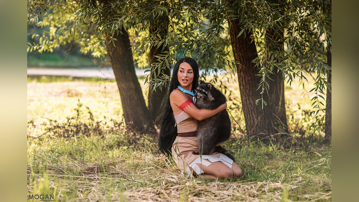 «Покахонтас» — один из моих любимейших диснеевских мультфильмов. Его главная героиня — красивая, яркая и со стойким характером, а сюжет основан на реальной истории. Главной звездой съёмки оказался живой енот Арсений, которого мы пригласили на роль Мико, закадычного друга Покахонтас. Со своими обязанностями он справился на отлично, ведь как и Мико в мультфильме зверёк баловался, бегал, кусался и всячески хулиганил. Оценить результаты нашего и его труда вы сможете на фото.