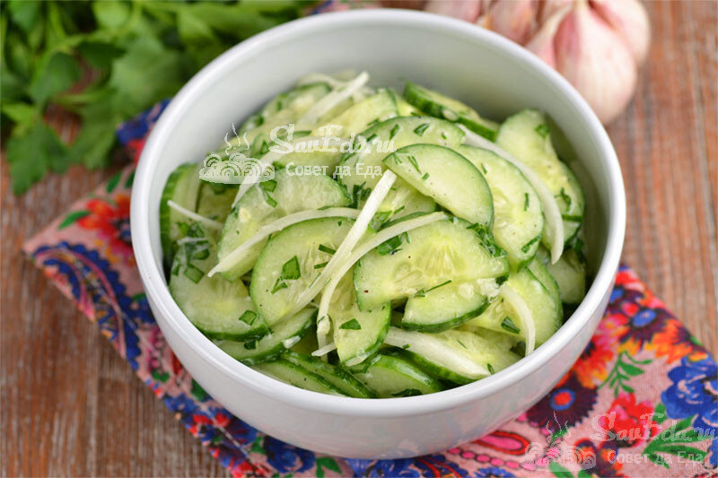 Салаты с разными интересными заправками из простых продуктов. По вкусу они не похожи друг на друга. Салаты очень простые и быстрые в приготовлении, готовлю их круглый год. Отлично подходят к любым вторым блюдам. Главный ингредиент – это свежие огурцы. Показываю 2 простых варианта. Первый вариант. Свежие огурцы (350 г) нарезаем тонкой соломкой и отправляем в миску. Две дольки чеснока мелко нарезаем или мелко натираем на терке, как у меня. Добавляем к огурцам. Посыпаем огурцы солью и свежемолотым перцем. Поливаем лимонным соком (1,5 ст. л.), оливковым маслом (1 ст. л.) и дополняем мелко нарезанным укропом (4 веточки). Салат перемешиваем, и он сразу готов к подаче. Салат получается хрустящий, невероятно ароматный и с приятной легкой кислинкой. Второй вариант. Для заправки салата в миску добавляем измельченный чеснок (2 зубчика), майонез (1 ч. л.), растительное масло (3 ст. л.), сахар (1 ч. л. без горки), уксус (6% 1 ст. л.) и молотый перец. Хорошо перемешиваем до растворения сахара и кисл