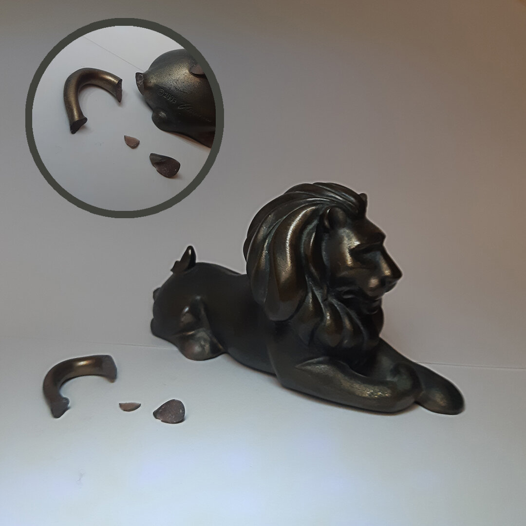 Мы вам этого не рассказывали, но в этом году произошло неприятное событие: мы уронили символ и талисман студии — льва, который появляется во всех наших интро, заставках и брендовых материалах. Расхреначили ему хвост в дрянь — несколько мелких кусочков, почти крошек и большие отломанные детали.