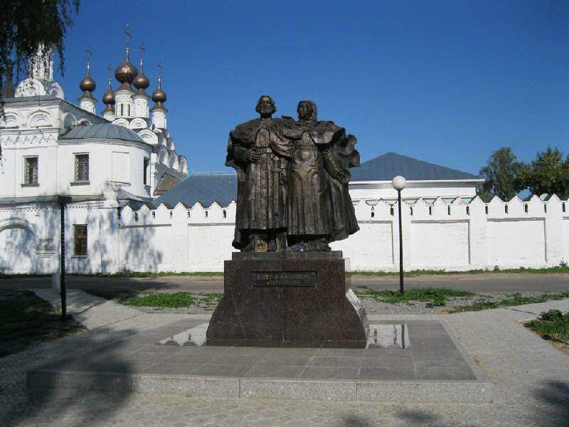 - Скульптура Петра и Февронии Муромских. Княжеское семейство стало идеалом для православных семей. Это покровители верной и преданной любви. Сегодня такой памятник можно встретить в шестидесяти населенных пунктах Российской Федерации. На муромской площади его возвели в 2012 году. Найти скульптуру можно на входе в Свято-Троицкий женский монастырь. Гранитный постамент, на котором стоят князь и княгиня, весит семь тонн. В ногах семейной пары есть кролик. Бытует легенда, что если хорошенько потереть его нос и загадать желание, то оно обязательно сбудется. Монумент возведен на пл. Крестьянина.
