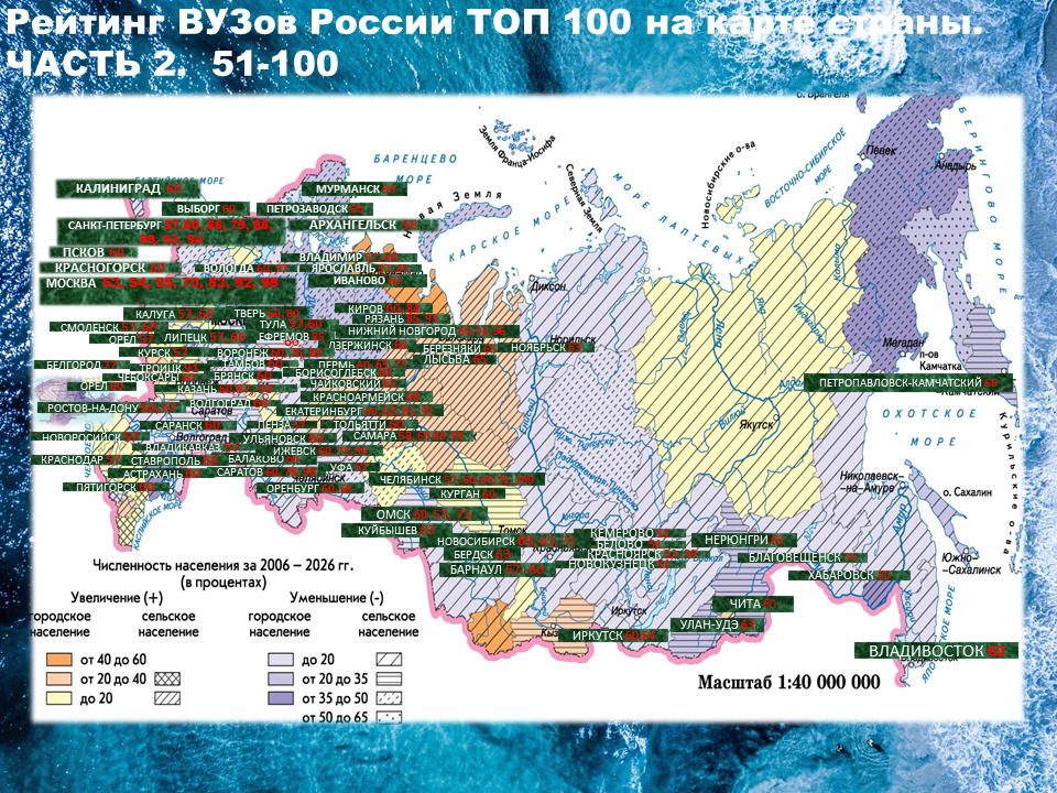 В основном ВУЗы страны сосредоточены в западной части территории России. Для Дальнего Востока вводятся новые программы развития региона, будем надеяться, что качество образования будет расти, как и показатель рождаемости. Ведь Россияне счастливые обладатели огромной и разнообразной территории и грамотно развивая муниципалитеты и людей, мы сможем обеспечить светлое будущее для наших детей.